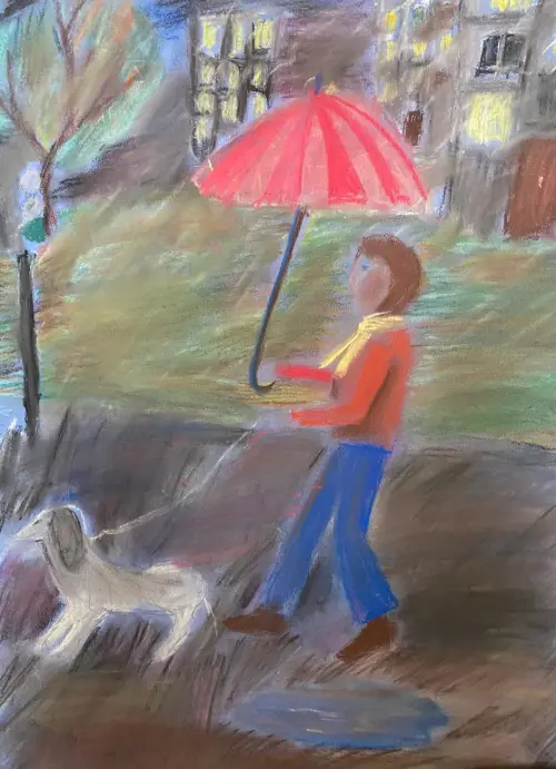 На рисунке изображено, как Александра гуляет возле дома со своей любимой собачкой Мотей