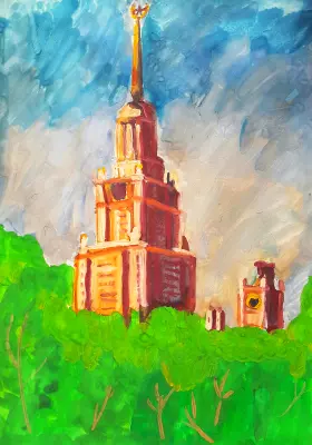 Один из любимых моих районов Москвы – Воробьевы горы, на рисунке показано высотное здание Московского государственного университета, это вид из окна квартиры наших родственников.