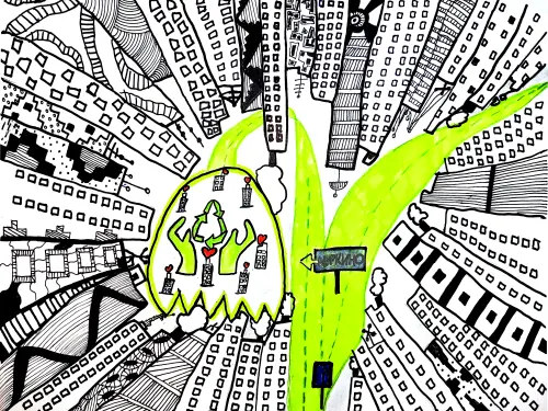 Я нарисовала район, в котором я проживаю. Я думаю, что мой район самый чистый, красивый и экологичный. Символ района Куркино - ландыш, поэтому я изобразила мой район в виде этого цветка.