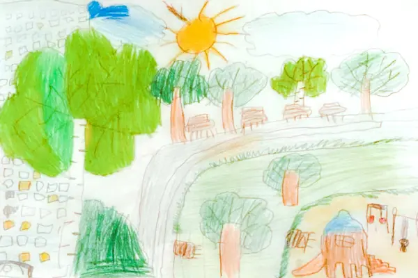 Меня зовут Алина, мне 7 лет. Я нарисовала мой двор утром, когда в нем пусто. А к вечеру там собирается много детей и мы весело проводим время. В нашем дворе есть и горка, и качели, новый игровой комплекс. Я очень люблю мой уютный двор.