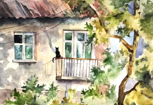 Во время пленэра меня впечатлил уютный дворик. Лучи солнца и тени от дерева, кошечка на балконе. Такой сюжет меня вдохновил на теплую акварельную картину.