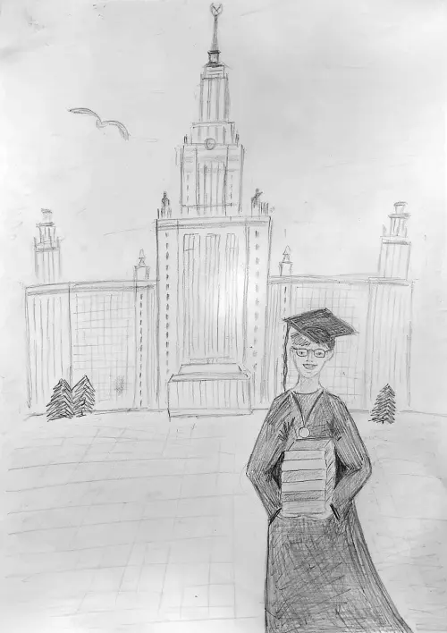 На этом рисунке я изобразил свою мечту поступить в МГУ и стать ученым-биологом. Для этого нужно много учиться и прочитать много книг. МГУ я срисовал с фотографии, а себя - из зеркала, только вообразил себя в шапке и мантии.