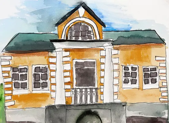 На работе изображен флигель усадьбы Валуево. Работа выполнена в смешанной технике карандашом, маркерами, акварелью на хлопковой бумаге размера А3. Работа написана с натуры.