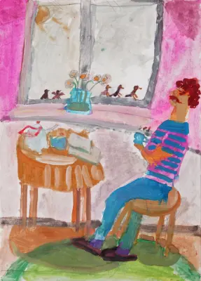 Я живу на улице Крупской, на седьмом этаже. Из окна я могу видеть небо. На подоконник иногда садятся птицы. Я нарисовала, как мой папа пьёт чай и смотрит в окно.