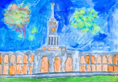 Лето. Вечер. Салют на Северном речном вокзале на день города. Северный речной вокзал в Москве — один из двух речных вокзалов Москвы (ранее Химкинский речной вокзал). Это главное здание комплекса сооружений канала Москва-Волга (в настоящее время — канал имени Москвы).