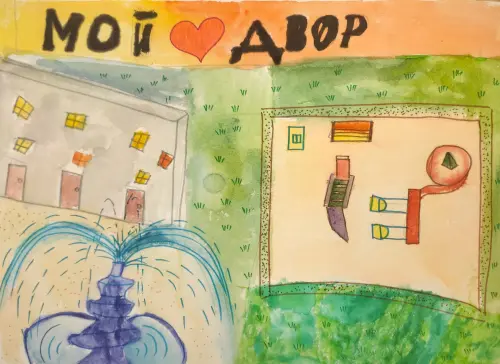 Рисунок моего двора около дома, где я гуляю с друзьямиЯ нарисовала мой двор около дома, где я гуляю с друзьями, там есть качели, скамейки, горки, но нет фонтана. Но я всё равно его нарисовала, потому что с фонтаном было бы интереснее. Я люблю свой двор.