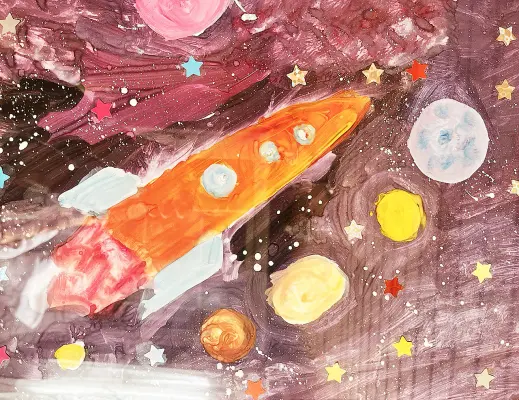 На рисунке нарисован космос над нашим районом. В космосе находятся небесные тела: звёзды, планеты и их спутники, астероиды, кометы, метеороиды. Звёздные скопления и отдельные звёзды образуют галактики.