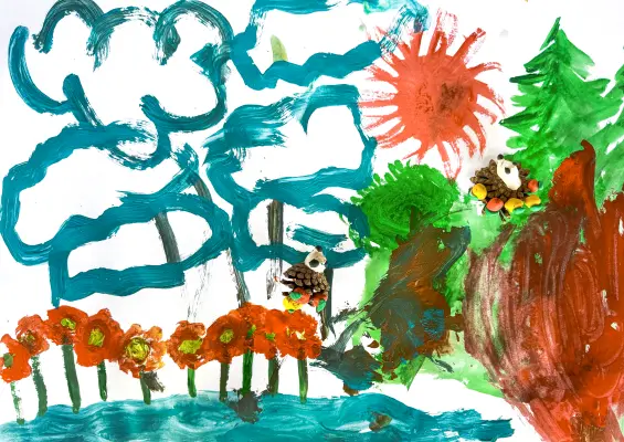 На своем рисунке я изобразила природу в моем любимом парке «Новодевичьи пруды». Мы часто гуляем там с мамой и сестричкой. А еще я очень люблю ежиков, поэтому около деревьев у меня сидят два ёжика из пластилина и шишек.