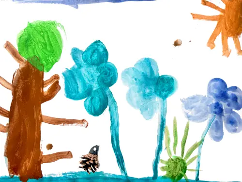 Я обожаю наш сквер, где мы гуляем с мамой и папой практически каждый вечер! Поэтому на своем рисунке я изобразила дерево, цветы и кустик, как в сквере. А как-то раз мы с папой увидели ёжика! Поэтому вместе с рисунком я сделала ёжика из пластилина и шишки, который живет в нашем сквере.