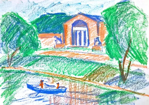 На берегу реки раскинулись густые деревья, создающие тень и уютную атмосферу. Вдали виднеется усадьба «Кузьминки», которая гармонично вписывается в пейзаж. Это историческое здание напоминает о времени, когда природа и архитектура сосуществовали в идеальном единстве.