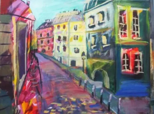 Моя работа называется "Улочка". Я люблю гулять по Москве, любоваться старыми зданиями и небольшими улочками и переулками. Хотя Москва преображается, строится очень много домов и парков, но мне нравится гулять по старым улочкам.