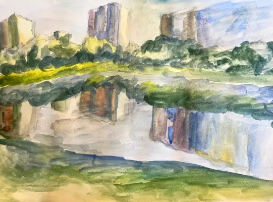 В парке у реки Городня мы с родителями любим гулять. Мне нравятся ее живописные берега. По выходным там здорово кататься с друзьями на велосипеде. Близлежащие жилые дома красиво отражаются в реке.