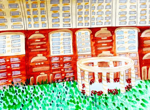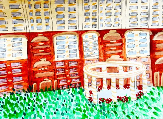 Работа выполнена акварелью. На рисунке жилой комплекс «Династия». Выбрал именно такой объект, чтобы его изобразить, потому что мне он очень нравится. Этот комплекс красивый и современный.