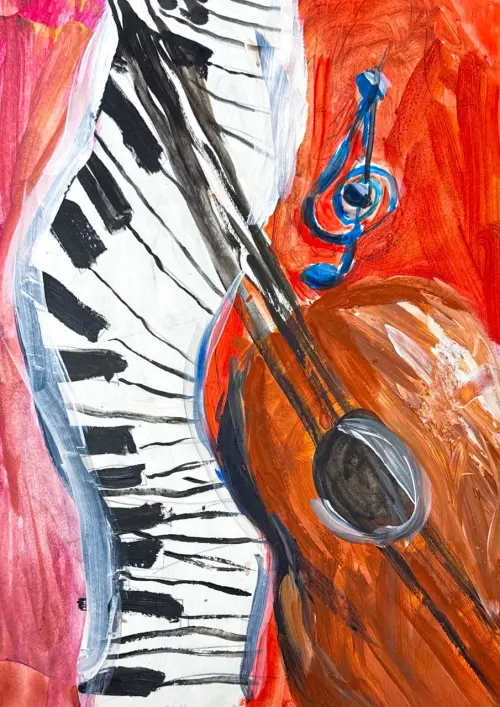 На холсте разворачивается симфония цвета и формы, где каждая линия и оттенок воспевают неуловимую, но всепоглощающую любовь к музыке. Изображение словно вибрирует в такт невидимому оркестру, передавая эмоциональную глубину и страсть, которую музыка рождает в душе художника.