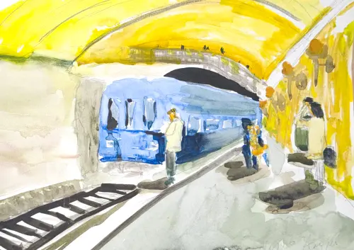 Работа, несмотря на свою простоту, вызывает ощущение сопричастности. Зритель словно оказывается на этой платформе, ощущая вибрацию приближающегося поезда и запах сырости, присущий метрополитену. Это не просто изображение – это зарисовка из жизни, пойманная художником и перенесённая на бумагу.