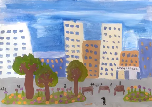 Любимая библиотека, много красивых деревьев и клумб с цветами и есть хорошие, добрые соседи. В моём дворе находится большая площадка для детей, где мы играем.