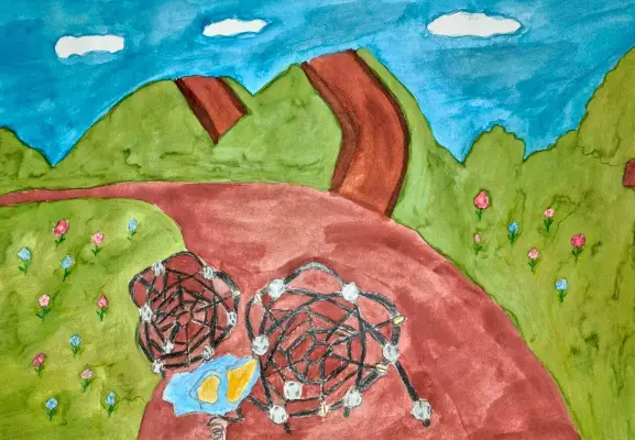 На рисунке изображена детская площадка в парке 70-летия Победы. Мне нравится гулять в этом парке. В этом парке есть велодорожки и горки, на которых я люблю кататься. Ещё есть световой фонтан.