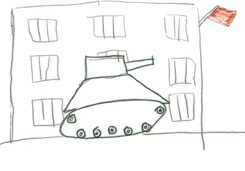 На рисунке изображен танк на фоне нашей улицы. Так Леша видит празднование Дня Победы в Великой Отечественной Войне в нашем любимом районе Северное Тушино.