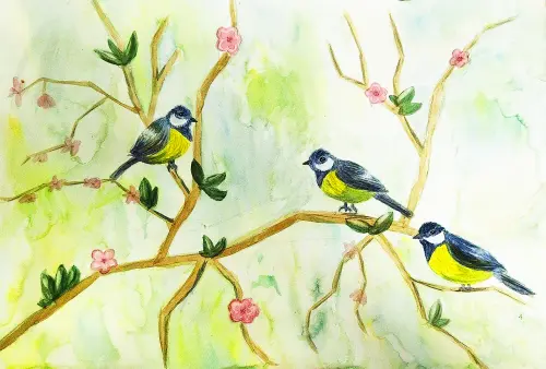 На голых ветках дерева, как новогодние игрушки, сидят воробьи – шустрые, коричневатые, с чёрными пятнышками на грудках. Они перепрыгивают с ветки на ветку, будто играют в догонялки.