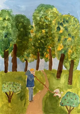Я живу в Отрадном: здесь я родилась и расту, хожу в школу и гуляю с друзьями. Рядом с метро - небольшой сквер, где можно весело провести время на спортивной, детской и фестивальной площадках. Мечтаю о собаке, поэтому на моём рисунке пудель на прогулке. Он в красных сапожках, на красном поводке, радуется лету!