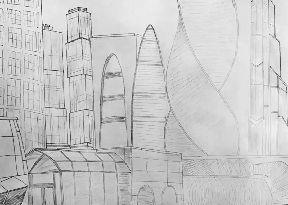 Рисунок представляет собой детальное изображение московского делового центра Москва-Сити глазами ребенка. В центре композиции — знаменитые небоскребы комплекса, выполненные яркими красками, подчеркивающими их величие и футуристичность. Башня "Федерация" выделяется своими изящными линиями и сверкающими окнами, отражающими солнечный свет. Рядом возвышаются башни "Империя" и "Меркурий Сити Тауэр", создавая ощущение динамики и движения вверх.