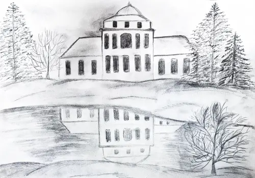 Рисунок, выполненный простым карандашом десятилетним ребенком, демонстрирует усадьбу Вороново в её величии. На переднем плане изображен пруд, в котором чётко видно отражение усадьбы: аккуратные линии и детали фасада подчеркивают архитектурную красоту.