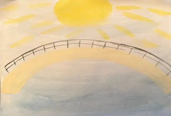 На рисунке изображен яркий солнечный день, запечатленный через оконную раму. Солнечные лучи проникают через окно, наполняя пространство теплым золотистым светом.