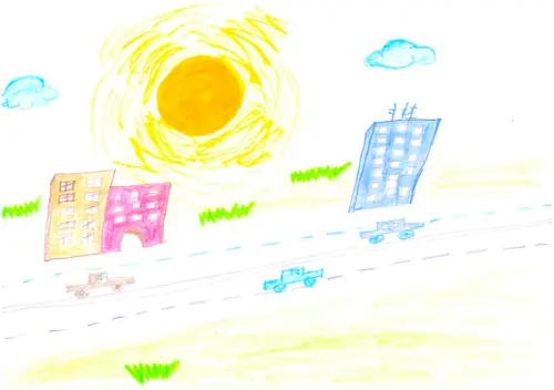 На своем рисунке я изобразила район Северное Медведково. Наш район очень зеленый, уютный. Вечером у нас красивый закат и свежий воздух. Хочется, чтобы каждый побывал у нас в районе и почувствовал эту теплоту и комфорт.