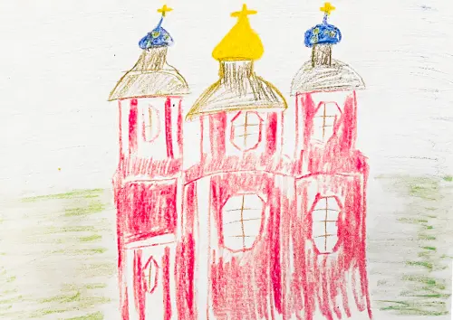 На рисунке изображен величественный православный храм, стоящий на возвышении. Архитектурный облик храма впечатляет своей монументальностью и гармонией форм.