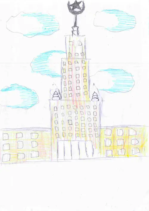 Я живу в Раменках, на моем рисунке изображен главный корпус университета, символа науки и образования. Я хочу учиться в МГУ на программиста и быть как мой папа.