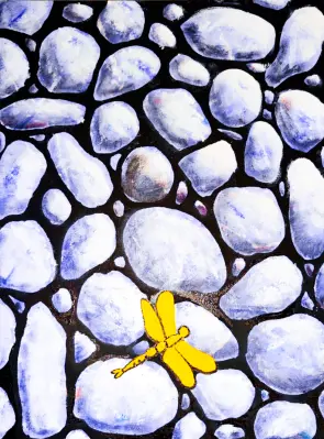 Однажды гуляя вдоль набережной, увидела как на камешках грелась стрекоза. Мне так это понравилось, что именно этот момент захотелось запечатлеть, поэтому его и нарисовала.
