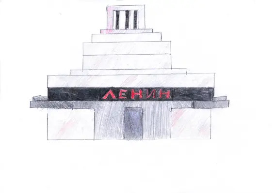 На рисунке изображён мавзолей с величественной архитектурой. Его купол сверкает на солнце, а колонны высятся по бокам. Вокруг цветы и зелёные растения создают гармоничную атмосферу, символизируя покой и вечную память.