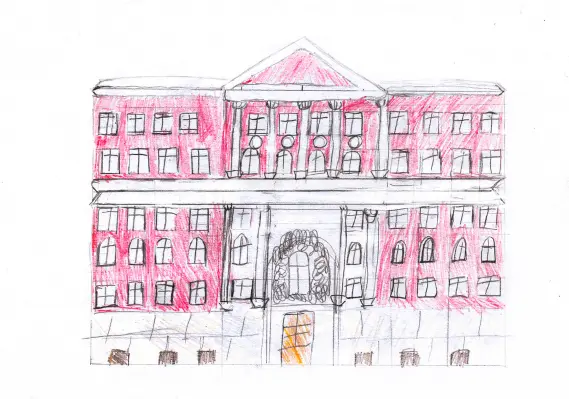 На рисунке дом культуры района: светлое здание с широкими окнами и входной лестницей. У него просторный двор, где проходят концерты и праздники. Рядом цветники, дети играют, создавая атмосферу радости и творчества.