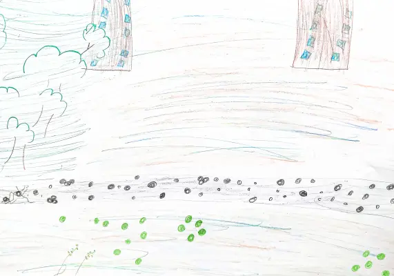На рисунке изображены «Удальцовскае пруды», рисунок нарисован после прогулки на детской площадке, расположенной в Удальцовском парке культуры и отдыха.