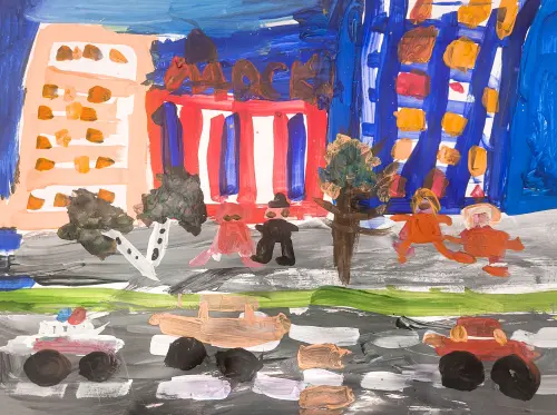 Мы с папой нарисовали улицу Череповецкая. Это основная улица, которая проходит через весь наш район. На рисунке изображены жилые дома, машины, люди. В центре рисунка мы нарисовали кинотеатр. Хотя его нет в нашем районе, но мы надеемся, что он когда-нибудь появится.