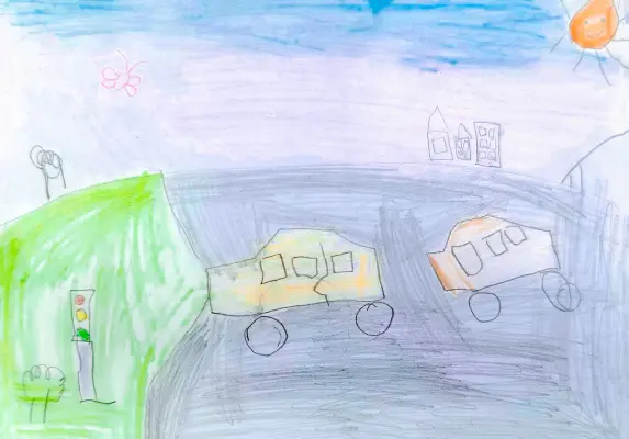 На рисунке «Машинки» изображена оживлённая улица с автомобилями. Яркие краски и детализированные машины создают атмосферу радости и веселья. Видно, что ребёнок вложил в рисунок свою страсть к играм с машинками и любовь к прогулкам на свежем воздухе.