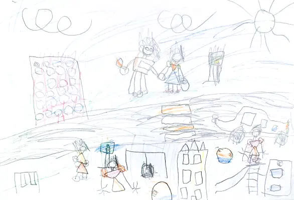 На рисунке «Весёлая компания играет во дворе» мы видим яркий и жизнерадостный образ детского двора. На картине изображены дети, которые весело проводят время: они могут играть в игры, общаться друг с другом или просто наслаждаться моментом.