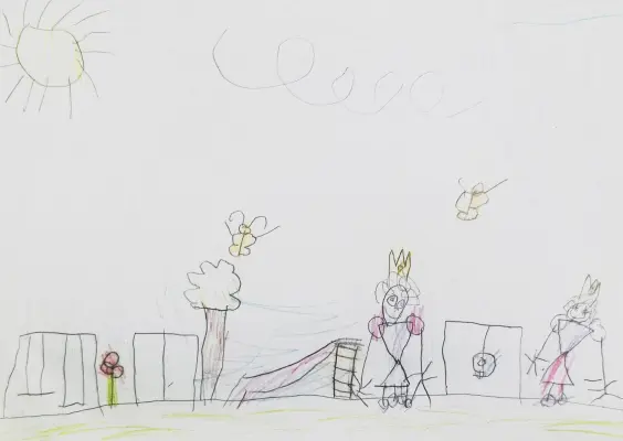 Каждый элемент рисунка символизирует радость и веселье, которые ребёнок испытывает во время игр во дворе. Через этот рисунок юный художник делится своими впечатлениями и эмоциями, которые он переживает в общении со сверстниками и во время активных игр.