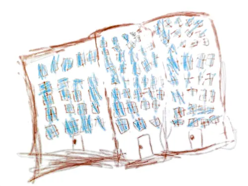 На рисунке изображено много этажей, окон и подъездов. Эти детали подчёркивают масштаб и разнообразие пространства, которое ребёнок считает своим. Многоэтажные дома часто ассоциируются с большим количеством возможностей и перспектив, а множество окон и подъездов — с доступностью и открытостью мира.