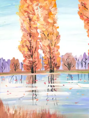 На рисунке "На берегу Клязьмы" изображён осенний пейзаж, который наполняет зрителя чувством тепла и умиротворения. На переднем плане раскинулась река, на берегу которой стоят деревья, нарядившиеся в шёлковые золотистые и ярко-красные листья, которые осенью выглядят особенно эффектно. Ветер, похоже, слегка колышет их, и некоторые из листьев уже начали медленно падать, покрывая речную гладь.