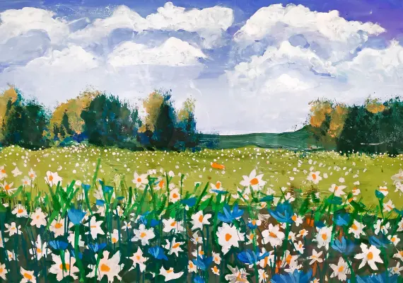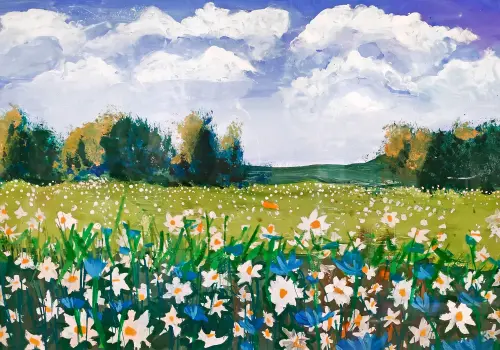 На картине запечатлён удивительный летний пейзаж, который излучает свет и радость. Просторная пойма реки, обрамлённая изящными зелёными травами и яркими цветами, создаёт ощущение свежести и живости. На переднем плане художник изобразил цветущие ромашки с их белоснежными лепестками и яркими жёлтыми сердцевинами. Эти скромные, но такие притягательные цветы будто приглашают нас остановиться и насладиться их красотой.