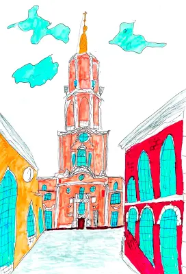 На картине изображена башня Меньшикова, что расположена на Чистых прудах и является уникальным архитектурным сооружением православного храма Церкви Архангела Гавриила, работа была выполнена маркерами и линером. Выполнил мальчик Никита Антюшин, 9 лет.