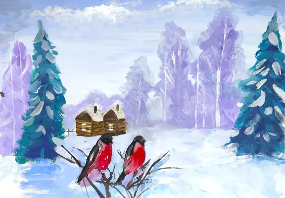 На пейзаже "Зима в Рязановском" запечатлён живописный зимний ландшафт, наполненный атмосферой тишины и уюта. Картина передаёт красоту зимней природы, где всё покрыто мягким белым снежным одеялом, создающим ощущение сказочной идиллии. На переднем плане видны яркие снегири, грациозно сидящие на ветках кустарника. Их красные грудки контрастируют с белоснежным снегом, добавляя в картину живые акценты и ощущение радости. На среднем плане изображены аккуратные, уютные домики.