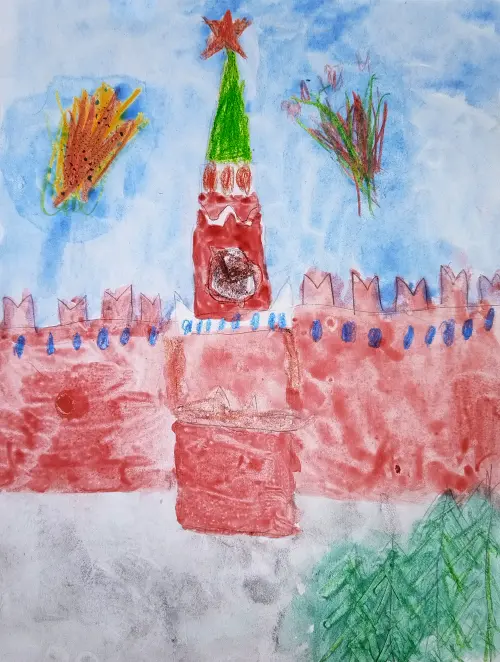 На рисунке изображён символ нашей страны - Московский Кремль. Это одна из главных достопримечательностей столицы и всей России. Здесь всегда гуляют прохожие, приезжает много туристов.