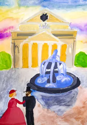 Величественный Большой театр - словно портал в другую эпоху. Перед ним – две пары, одетые в изысканные одежды XII века, спешат на представление. Контраст времён, магия театра и очарование старины создают неповторимую атмосферу. Яркие краски и внимание к деталям переносят зрителя в мир грёз и высокого искусства.