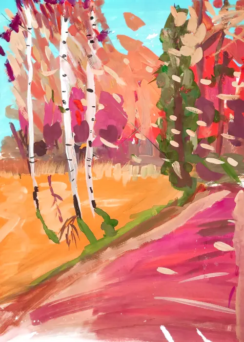 На осеннем пейзаже зрителя встречает яркая симфония цвета, которая радует глаз и наполняет душу теплом. В центре композиции раскинулся уютный лес, где деревья готовятся к зимнему покою. Их листья, окрашенные в богатые оттенки жёлтого, оранжевого и красного, словно рассыпаны по земле, создавая яркий ковёр из золота на фоне зелёной травы. Каждое дерево, обрамлённое уютным одеялом из опавшей листвы, выглядит как живое произведение искусства, наполненное жизнью.