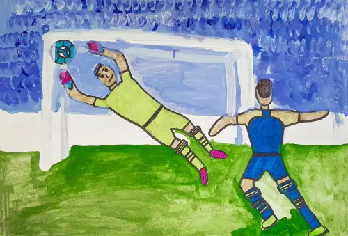 В динамичной работе юный спортсмен запечатлел свою страсть к футболу. Ребята увлеченно играют на поле, расположенном у парка «Северное Тушино». Чувствуется командный дух и азарт. Яркие краски передают радость от тренировок на свежем воздухе в любимом месте.
