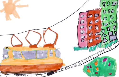 Я нарисовал трамвай, потому что очень люблю кататься на нем. Трамвай большой, он едет по рельсам. В Строгино едет трамвай номер 15. Я уже его узнаю. Ещё есть 21. Мне очень нравится мой район.