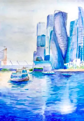 Работа "Москва-Сити с реки" полна городского очарования. Мимо сверкающих небоскребов проплывает прогулочный кораблик. Юный художник изобразил современный мегаполис, показав красоту архитектуры и динамику жизни столицы с необычного ракурса.
