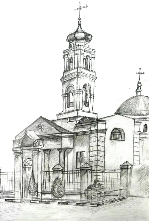 Рисунок выполнен простым карандашом, на нём изображён Храм преподобных Зосимы и Савватия Соловецких, который расположен в районе Гольяново и является памятником культуры